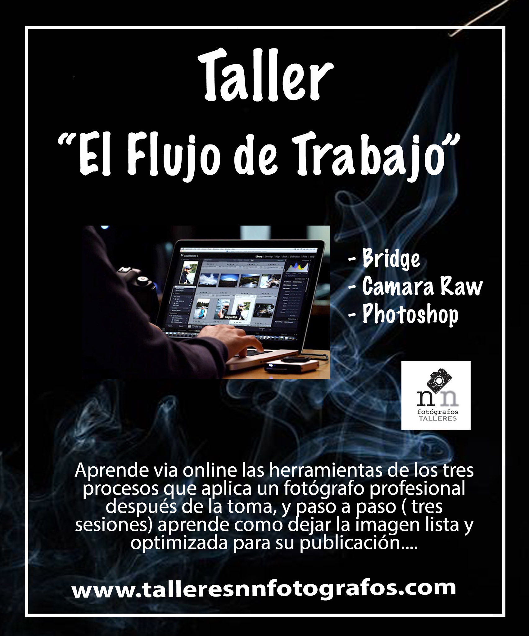 Y luego de la toma fotográfica ..qué?, sistematizar el proceso para el post-procesado es tambien parte importante de la labor de un fotógrafo y este taller online tiene como objetivo darle al alumno las tres herramientas más importantes (bridge, Camara Raw y Photoshop) para poder lograr al terminar este taller, crear tu propio flujo de trabajo, entender cada uno de las herramientas vitales con las que se enfrenta un fotografo profesional y optimizar el proceso hasta el producto final. En estas tres sesiones online creamos las bases para empezar a entender las herramientas fotograficas más avanzadas.